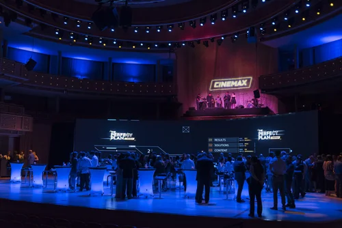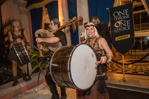As guests entered the Castle they experienced Royal Hall. A 10ft bar served as the centerpiece to the Hall, while minstrels played for guests entertainment. Sword swallowers and jesters performed for guests' amusement. When the time came, a herald announced that the King himself requested their presence outside in the terrace. Guests made their way to a presentation area. Led by executives, the presentation was a full on detailed story on how Cinemax is at it's peak with the addition of the Game of Thrones series (HBO's most popular series to date). Guests also had the opportunity to see actor Jason Momoa (who played Khal Drogo in the 1st season of the series) and enjoyed a Q&A with him.